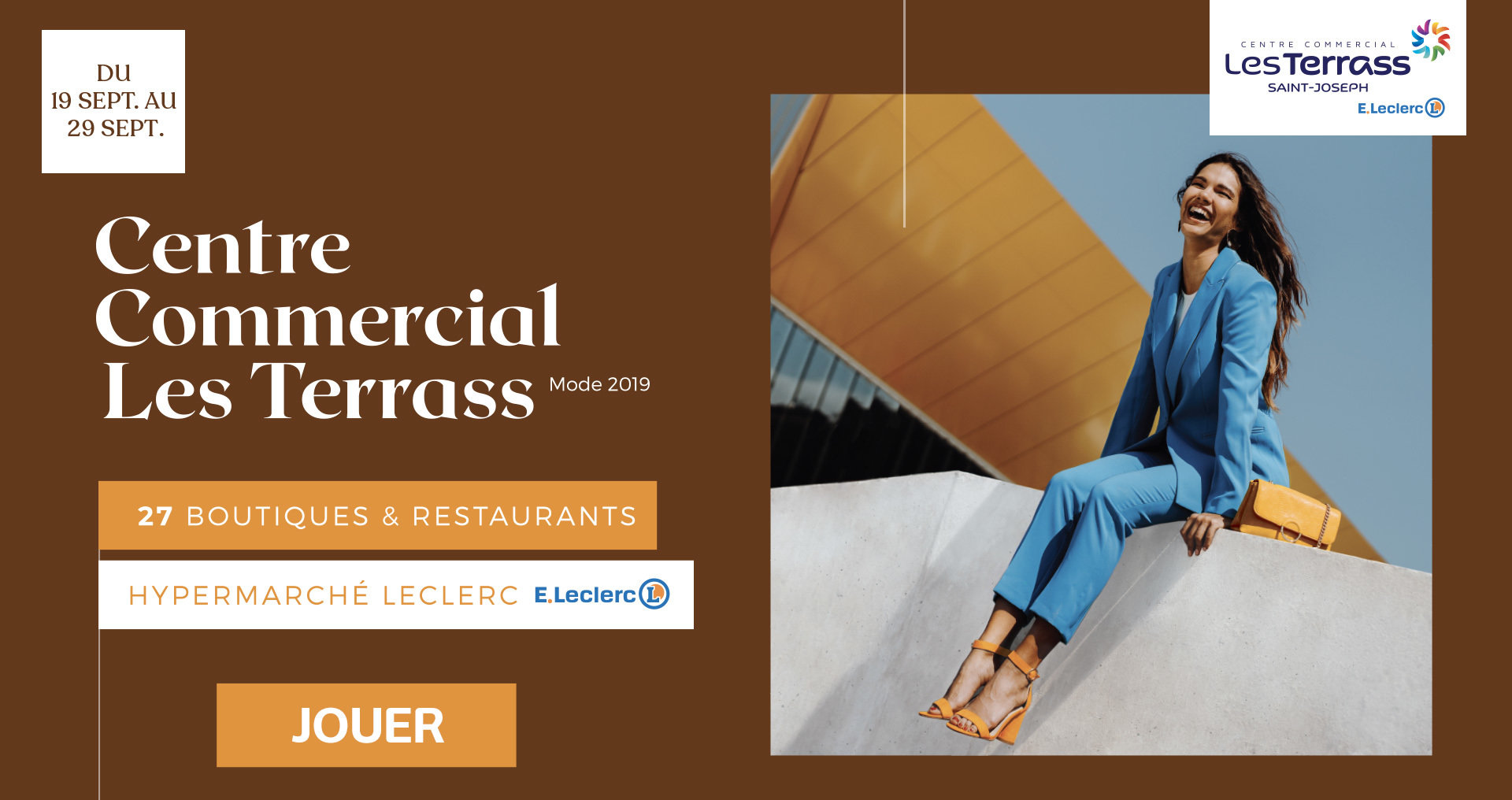 ARTICLE 4 : PRINCIPES ET MODALITES DU JEULe jeu est accessible depuis une connexion internet, sur ordinateur, smartphone et tablette depuis le site internet www.les-terrass.re du 19/09/2019 à 8h00 au 29/09/2019 jusqu’à 23h59. Il est également accessible depuis les deux bornes de jeu situées dans la galerie marchande du centre commercial Les Terrass à Saint Joseph. Pour jouer il suffit de :